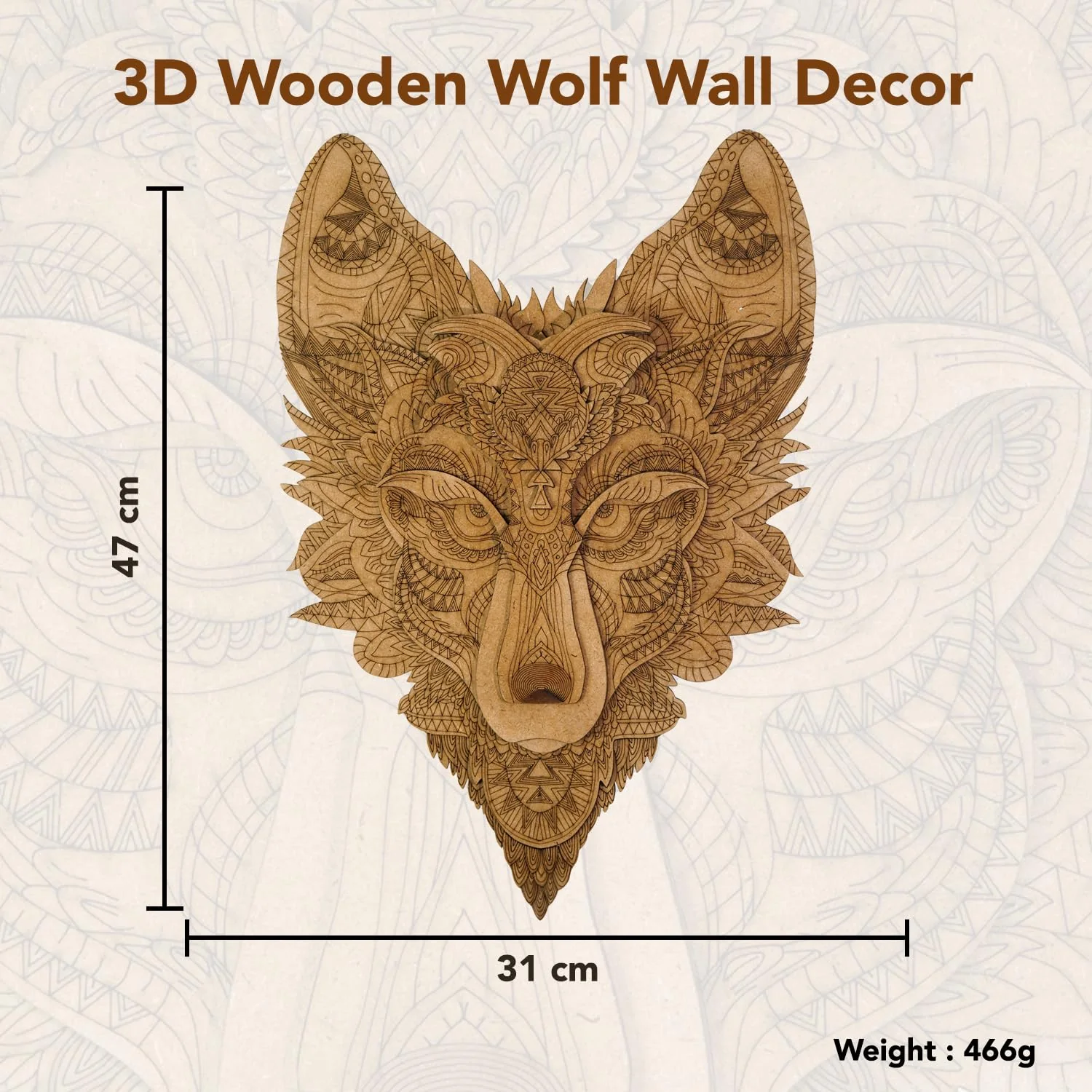 Introducing the 3D Laser Cut Wooden Wall Art - Wolf Face by Ekhasa, a stunning piece crafted from high-quality engineered MDF wood. Finished in a sophisticated brown matte, this wall art frame features intricate, multi-layered designs that create a striking 3D effect. Measuring in standard size, it is perfect for adding character to any space including bedrooms, living rooms, home offices, and even outdoor settings like porches or gardens.